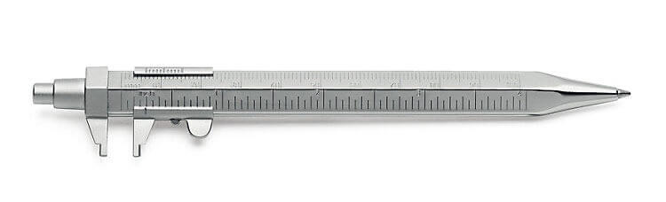 Now here’s a pen you can use to jot down notes – and then turn around and perform maintenance on your automobile. The German-made ballpoint pen is constructed of chromium plated brass and has what appears to be a pentagonal barrel. Built in are a ruler, a tire tread gauge, a caliper rule and a thread scale. This is the pen that engineers must have naughty dreams about.