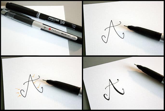 Jones Design Company offers a more detailed example of how to fake calligraphy using the same method. Jones recommends starting with a pencil, then using a Pilot Precise extra fine to draw each letter. Once the letters are done, you can use the Precise to add thickness to all the downstrokes in the letter.