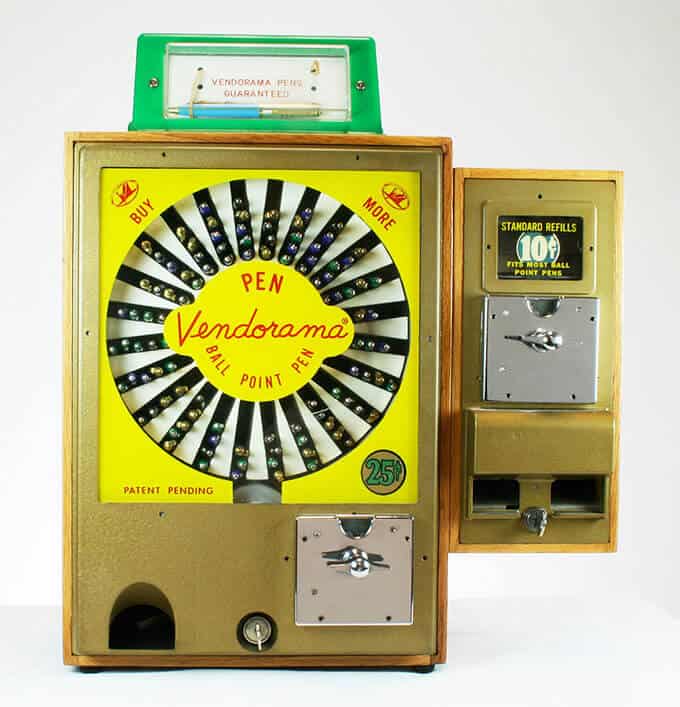 The Vendorama is a machine built in the 50s and 60s by Victor Vending Company in Chicago. They were built from oak, trimmed in chrome and baked enamel, and held up to 168 pens. The buyer dropped in a dime, turned the handle like a gumball machine and got one ballpoint pen.