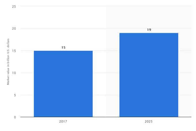 This statistic depicts the value of the pen market worldwide in 2017 and 2025. In 2017, the global pen market was valued at approximately 15 billion U.S. dollars and was forecast to reach a value of 19 billion U.S. dollars by 2025.