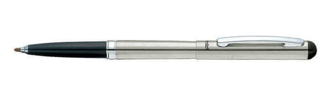 A silver brushed steel case has a black end stopper & tip on the cap displaying the Pentel logo.  The sturdy clip & ring that meets the cap is a contrasting silver colour.  This pen can be refilled with the MGN6S, unlike many other refills that slot inside the barrel, these are complete units therefore the top section in this case black makes up part of the barrel & contrast’s with the case.  Refills are also available with blue ink.