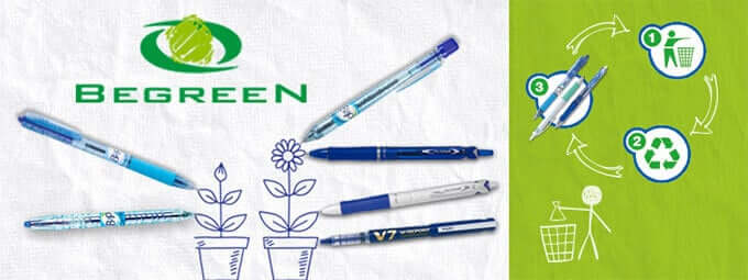 One manufacturer has stepped up to the challenge and this is Pilot Pens with their BeGreeN range of recycled pens. The BeGreeN range (no, we don’t know why the “n” is capitalized) is made from recycled plastics but look and function just like standard Pilot pens and mechanical pencils. According to the company, the percentage of recycled materials in pens is calculated by the weight, excluding replaceable parts such as ink cartridges or pencil lead.