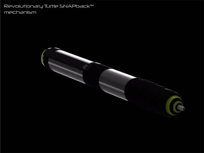 The Turtle Pen is a retractable pen, of sorts. But, instead of depressing a plunger to advance the writing point, the user pulls the bottom of the pen and lets it recoil. That’s what makes the “turtle head” tip on the other end pop out for use.