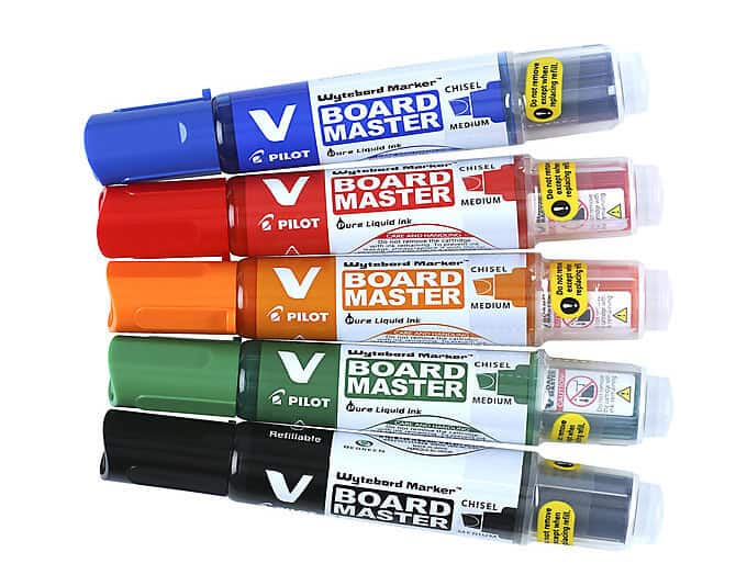 So despite there being an increasing number of cool smartboards & the existence of old school blackboards, if your board of choice happens to need a dry wipe marker the recycled Pilot V Board Master whiteboard marker could be the one for you!