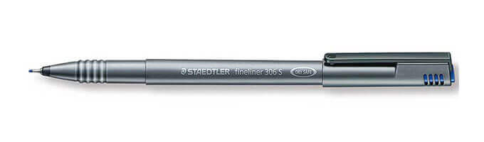 A metal clad fibre tipped pen that writes a 0.3mm line the Staedtler Fineliner 306 S contains dry safe ink, which is airplane safe.